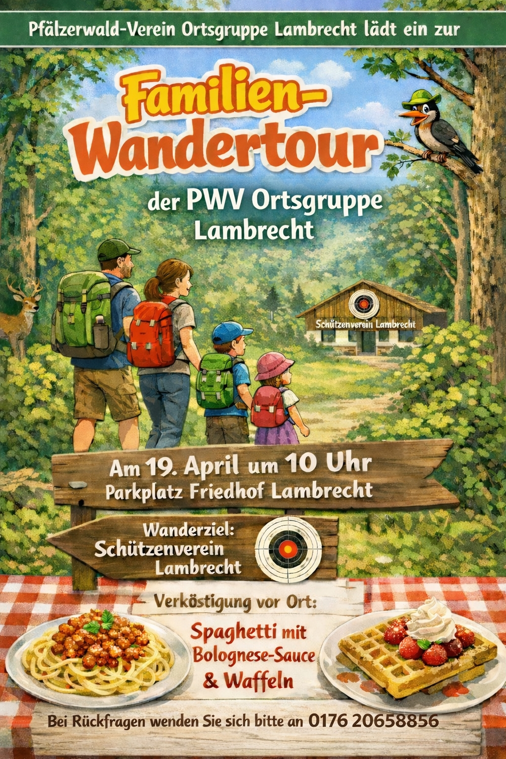 Am Sonntag, den 19.04.2026 findet eine erste Familien-Wandertour als Kennenlerntour statt. Die Wanderstrecke ist so festgelegt, dass diese auch für Kinderwagen oder Bollerwagen geeignet ist. Treffpunkt ist um 10:00 Uhr am Friedhof in Lambrecht und man wandert dann zum Vereinshaus der Schützengesellschaft Lambrecht ins Beerental. Die genaue Wegestrecke wird vor Ort festgelegt und richtet sich nach dem Alter der teilnehmenden Kinder. Die Schützengesellschaft öffnet an diesem Tag ihr Schützenhaus und die hungrigen Wanderer können sich mit Spaghetti und Hackfleischsoße stärken. Auch frisch gebackene Waffeln werden angeboten. Der Rückweg erfolgt dann auf direktem Weg.