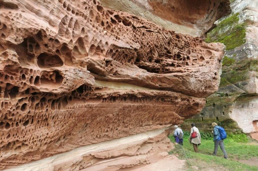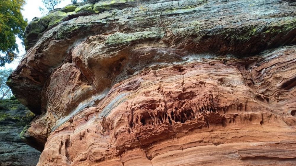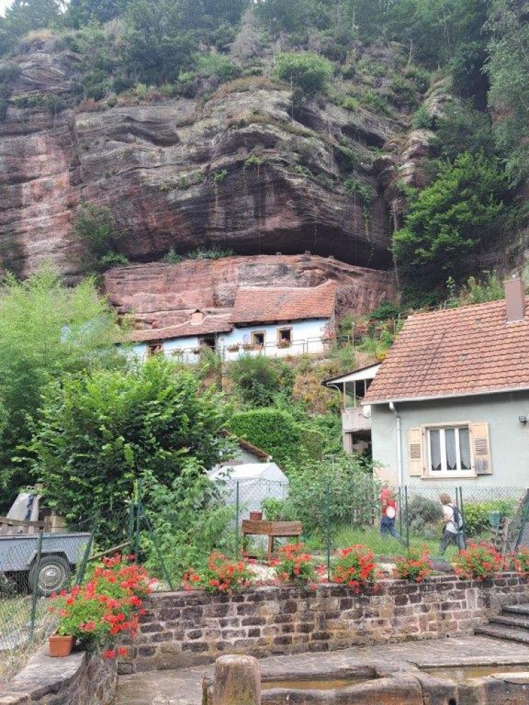 Zum Abschluss stand das kleine Dorf Graufthal auf dem Programm. Mehrere in die hohen Felsen aus rosa Sandstein gegrabene Höhlen dienten den Mönchen einer ehemaligen Benediktinerabtei als Lager, bevor sie nach und nach in Wohnhäuser umgewandelt wurden: Die Felsen dienten als Rückwand und das Gestein als Decke und Boden. Nur die hellblauen Vorderfassaden sind von Menschenhand erbaut.