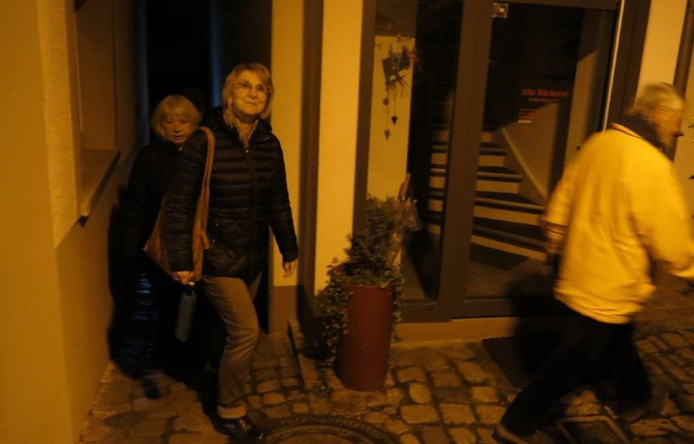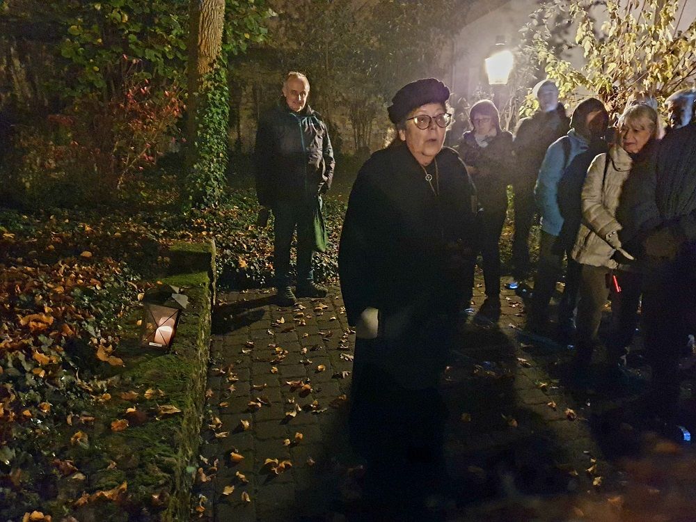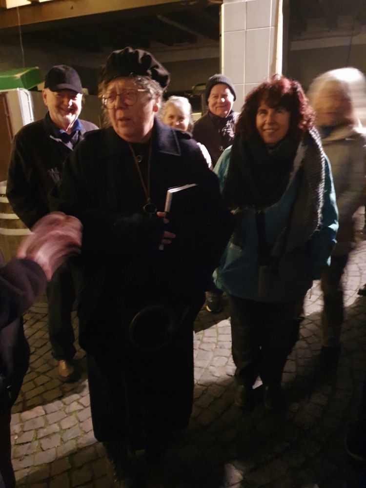 Die Fleckenmauer in Dalsheim ist die einzige, nahezu komplett erhaltene Ortsbefestigung in Rheinhessen aus dem Mittelalter. Teile der Mauer sind sogar begehbar. Unsere Tour startete hier am Obertor und führte uns an der Mauer entlang, an einem jüdischen Friedhof vorbei und durch das schöne Dorf. Nach ca. 3 km ohne Steigungen erreichten wir den Ortsteil Niederflörsheim, wo wir im Weingut Flörsheimer Hof zum Glühweinempfang erwartet wurden. Mit der Frau des Nachtwächters erkundeten wir anschließend die nächtlichen Gassen und Winkel von Flörsheim und lauschten den Sorgen und Nöten einer Nachtwächter-Ehefrau, eingebettet in die Geschichte um 1850.