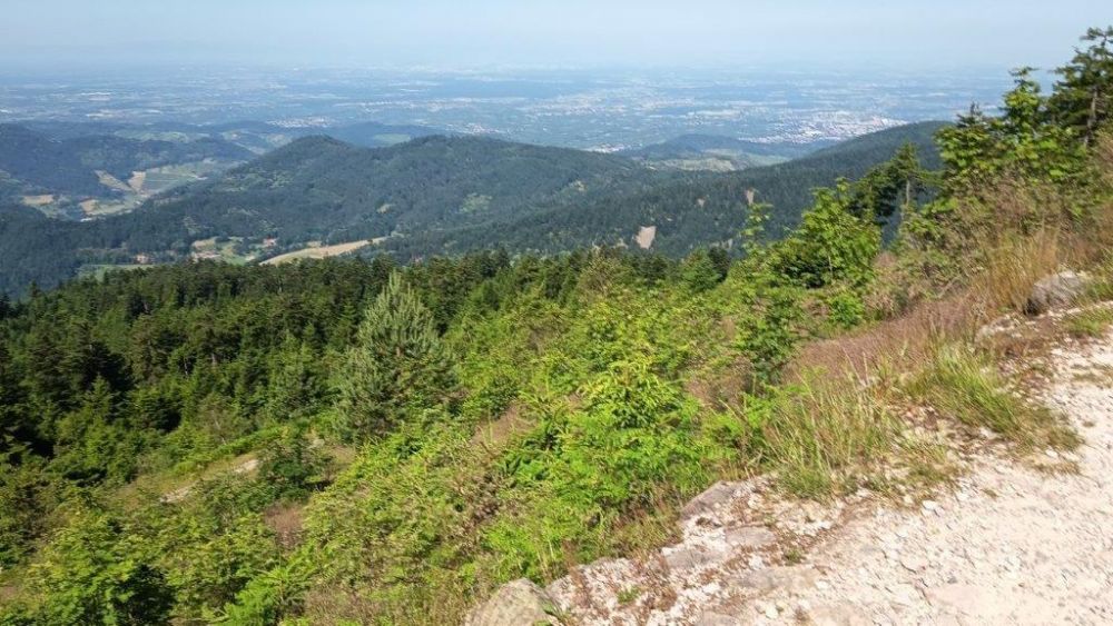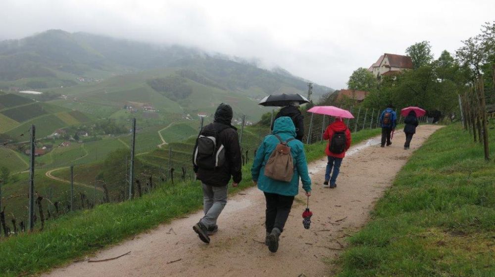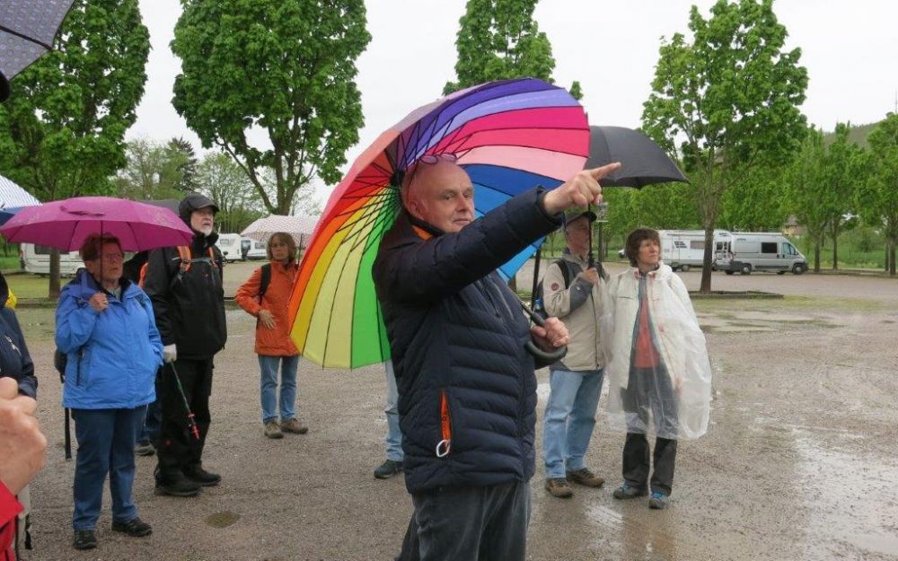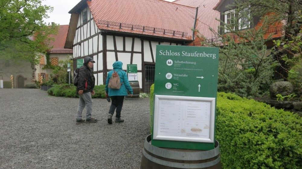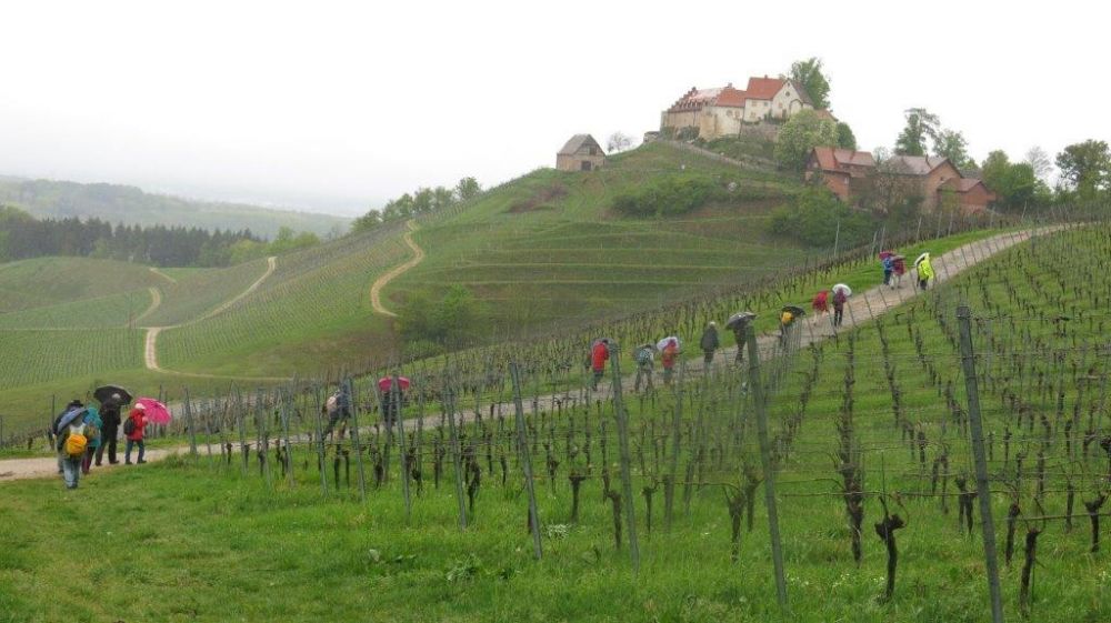 Wir folgten zuerst dem Durbach talabwärts, bevor wir kurz darauf über das Weingut A. Laible eine erste Steigung zu bewältigen hatten. Durch schmale Rebgassen und Wege erreichten wir den Rast- und Aussichtspunkt Plauelrainer Köpfle mit herrlichem Blick über Offenburg, nach Straßburg und zu den Vogesen. Danach folgten die Kapellenruine St. Anton und die Maiglöckchenhütte mit dem nächsten schönen Ausblick. Weiter ging es für ca. 3,5 km überwiegend durch den Wald, dabei tangierten wir immer wieder die Ränder von Weinlagen, bis wir zum Wahrzeichen von Durbach kamen, dem Schloss Staufenberg mit den aussichtsreichen Terrassen, wo wir zu unserer Mittagsrast einkehrten. Ein Glas Klingelberger (Riesling) vom Weingut Markgraf von Baden ist hier sozusagen Pflicht. Nach der Mittagsrast ging es entweder über den kürzesten Weg (Burgweg – Ortenauer Weinpfad – rote Raute mit blauer Traube) in die Ortsmitte von Durbach, evtl. noch mit Abstecher zum Steinberg-Häusle mitten in den steilen Rebhängen. Oder über die Brandstetter Kapelle, durchs Stürzelbachtal hinunter ins Durbachtal und immer am Durbach entlang, durch Durbach mit den schönen Fachwerkhäusern, zurück zum Festplatz.