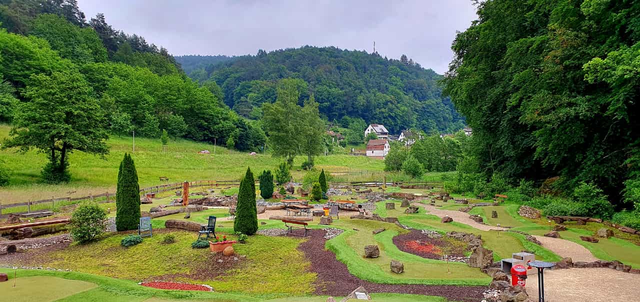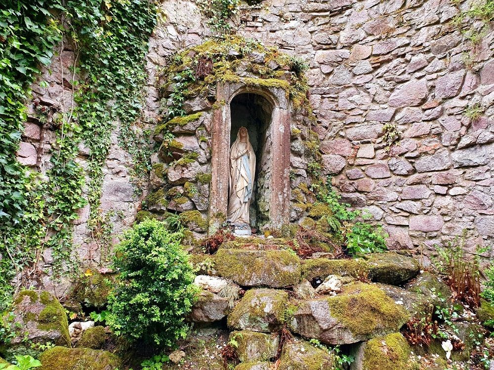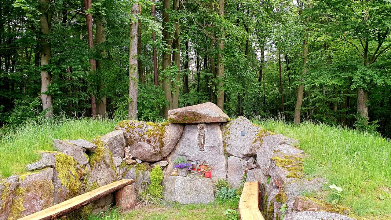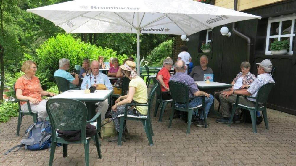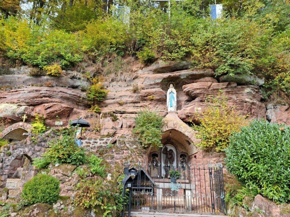 Für die Langwanderer ging es weiter, durch den Freizeitpark Eppenbrunn, am Aschbächel entlang, durch den Ort, die Bergstraße hoch zur Lourdesgrotte, wo wir die 1934/1935 erstellte Stätte der Marienverehrung besichtigten. Danach kehrten wir wieder zurück zum Hotel-Restaurant Kupper, um dort nach einer Wanderung von ca. 10 km und ca. 140 hm in der Jagdstube bzw. im Biergarten die Mittagspause zu verbringen.