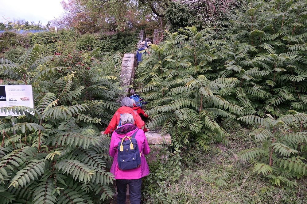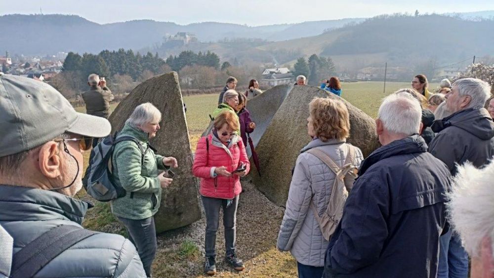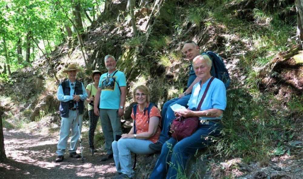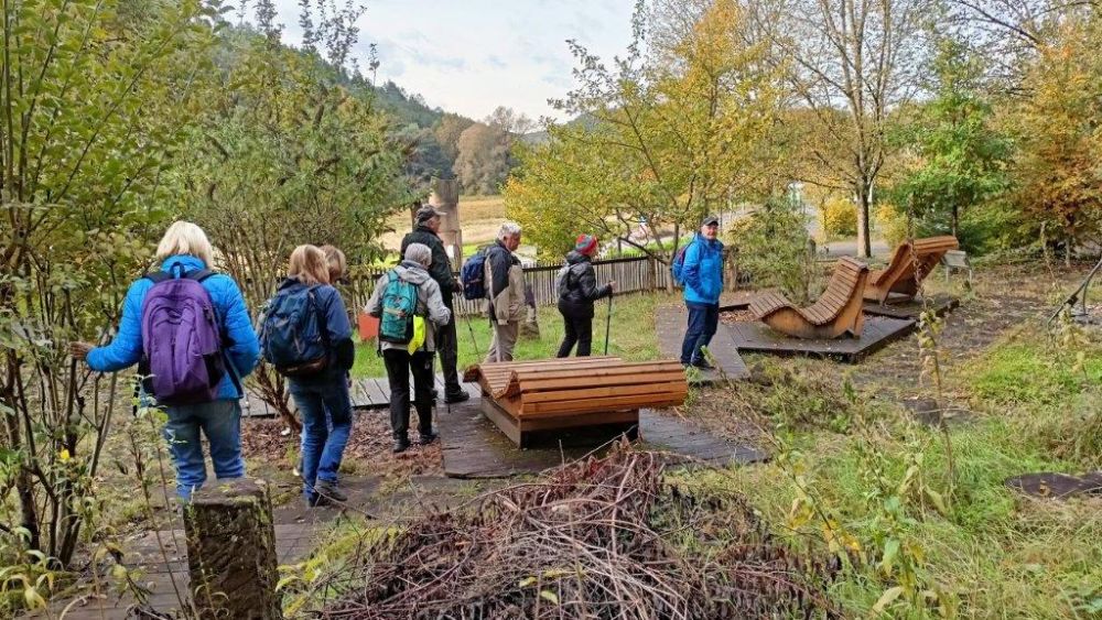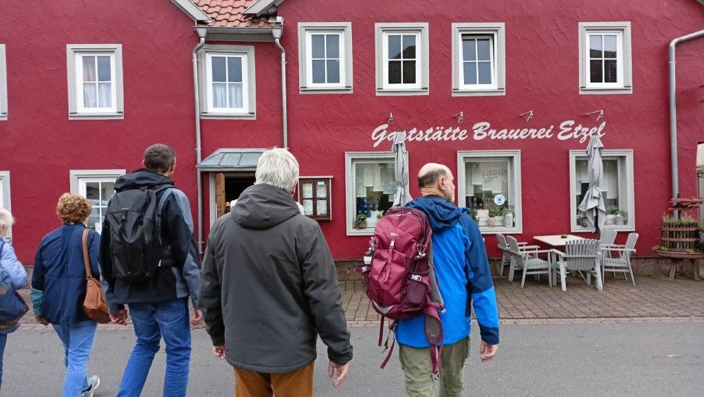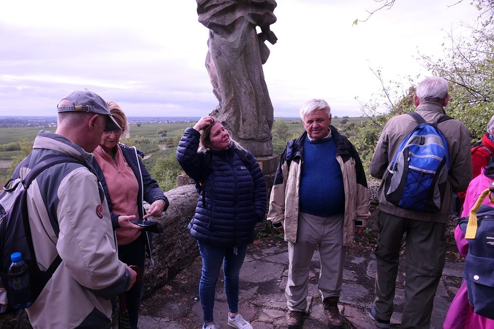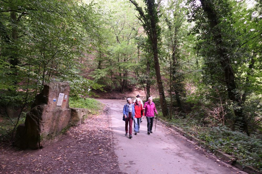 An der Lindenreihe vorbei ging es zur Hinterburg, wo wir an der Burgruine mit Holzstatue "Der Lauscher" eine kurze Besichtigungspause einlegten. Nach unserer Pause wanderten wir den Kunstweg entlang, vorbei an den Buntsandsteinskulpturen "Die Liebenden", "Ausschau", "Die Zeiten ändern sich" und am Wichtelhotel weiter die Treppen hoch zur Burg Schadeck, die auch "Schwalbennest" genannt wird. Von da hatten wir eine schöne Aussicht nach Dilsberg zur Dilsburg. Weiter ging es durch das Naturschutzgebiet Schwalbennest den Teufelssteinweg entlang, vorbei am Teufelsstein, Kleingemünder Brunnen von 1767 und Kleingemünder Kerwehaus, bis wir nach ca. 6,6 km unser Lokal in Kleingemünd für die Mittagspause erreichten.