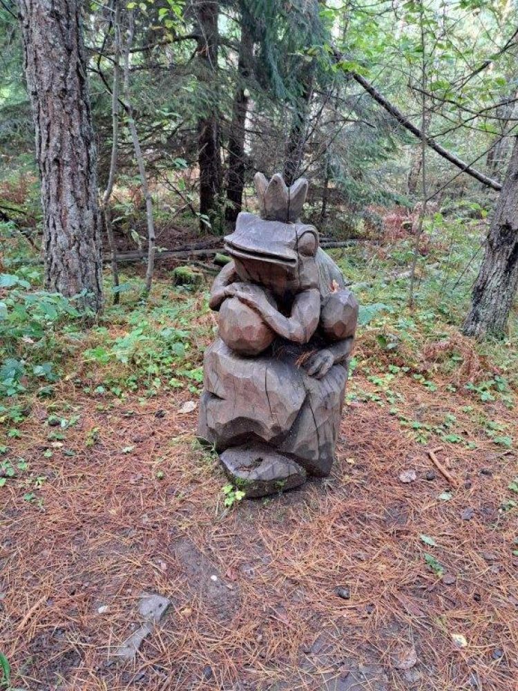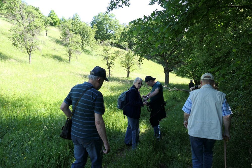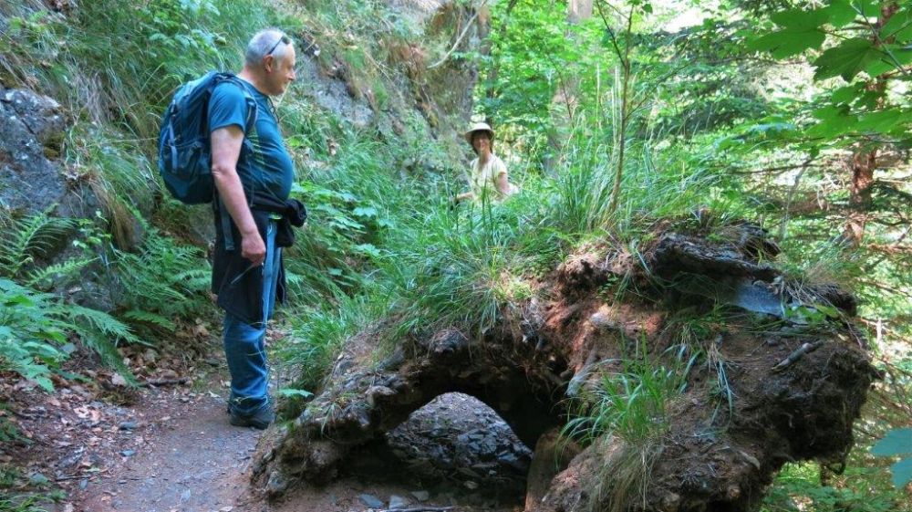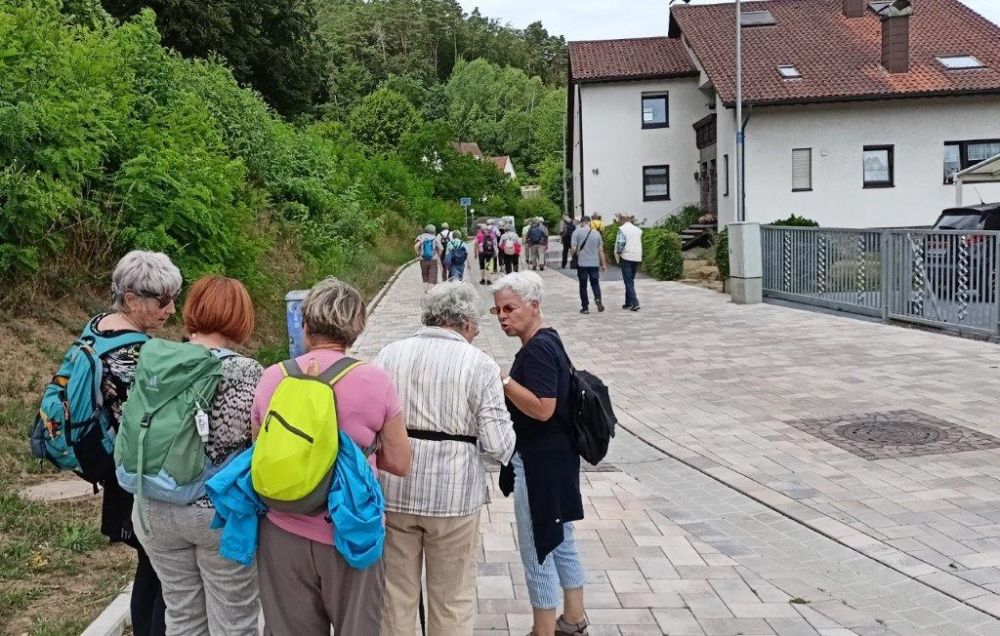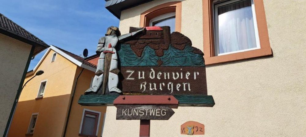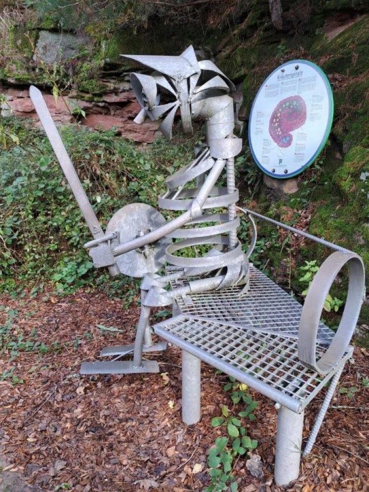 An der Lindenreihe vorbei ging es zur Hinterburg, wo wir an der Burgruine mit Holzstatue "Der Lauscher" eine kurze Besichtigungspause einlegten. Nach unserer Pause wanderten wir den Kunstweg entlang, vorbei an den Buntsandsteinskulpturen "Die Liebenden", "Ausschau", "Die Zeiten ändern sich" und am Wichtelhotel weiter die Treppen hoch zur Burg Schadeck, die auch "Schwalbennest" genannt wird. Von da hatten wir eine schöne Aussicht nach Dilsberg zur Dilsburg. Weiter ging es durch das Naturschutzgebiet Schwalbennest den Teufelssteinweg entlang, vorbei am Teufelsstein, Kleingemünder Brunnen von 1767 und Kleingemünder Kerwehaus, bis wir nach ca. 6,6 km unser Lokal in Kleingemünd für die Mittagspause erreichten.