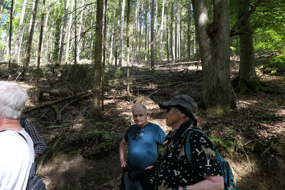 Vom Bahnhof Rheinau war es nur eine kurze Wegstrecke bis in den in der Nachbarschaft der Stadtteile Rheinau und Seckenheim gelegenen Dossenwald. In dessen Osten liegt das Naturschutzgebiet Hirschacker und Dossenwald, das etwa zur Hälfte auf der Mannheimer Gemarkung liegt und eines der bedeutendsten Flugsandgebiete Baden-Württembergs beheimatet. Starke Südwestwinde bliesen am Ende der letzten Eiszeit vor ca. 10.000 Jahren die Sande aus den trockengefallenen Teilen des Rhein-Flussbettes. Sie häuften sie auf der östlichen Rheinseite zu Binnendünen auf. Bei unserem Streifzug durch diese besondere Landschaft passierten wir auch den höchsten natürlichen Punkt Mannheims auf 114m ü.NN mit Gipfelkreuz und Gipfelbuch. Die Strecke verlief überwiegend auf Waldwegen mit teilweise sandigen sowie in geringem Umfang asphaltierten oder geschotterten Abschnitten.
