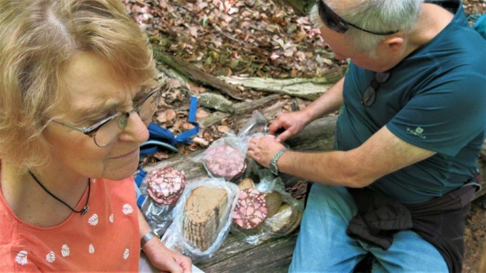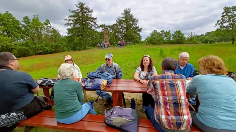 Unsere längere Tour (8 km) startete auf dem Potzberg, führte ein Stück am Wildpark vorbei, und überwiegend bergab ging es zur urigen und schön gelegenen PWV-Buchwaldhütte, wo uns die Wanderfreunde aus der Nordpfalz mit Gegrilltem und leckeren Kuchen und Torten verköstigten und wir auf die Teilnehmer der Kurztour (4 km) trafen. Interessant war unterwegs das "Gelbe Wasser", ein Wasseraustritt aus einem alten Bergwerksstollen. Das erdige Brauneisenerz gibt dem Wasser seine "gelbe" Farbe. Auch der Schützenbrunnen mit dem angrenzenden Teich fand unsere Bewunderung. Die Wanderstrecke führte uns danach ins Tal zum Bahnhof, wo der Bus auf uns wartete und nach Hause brachte.