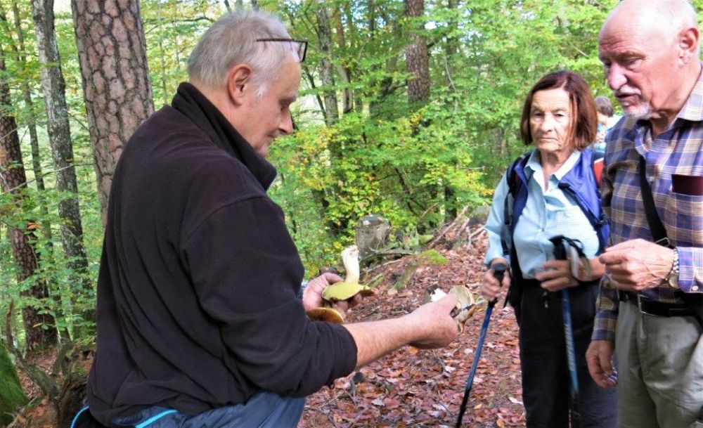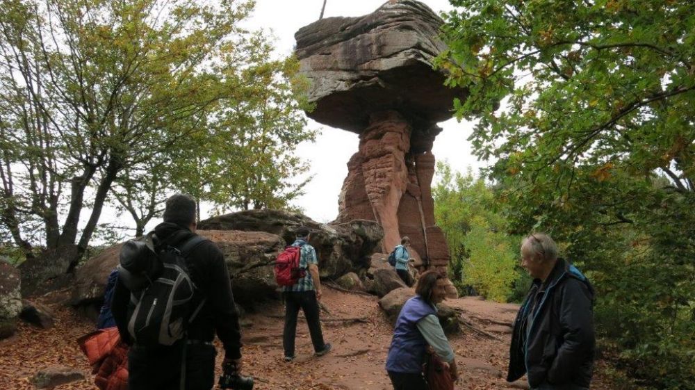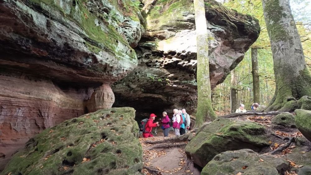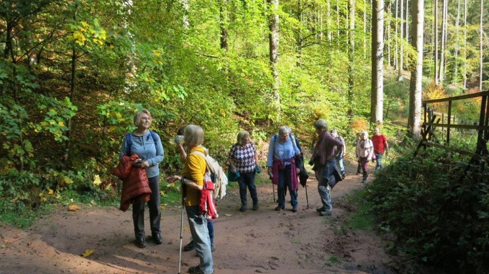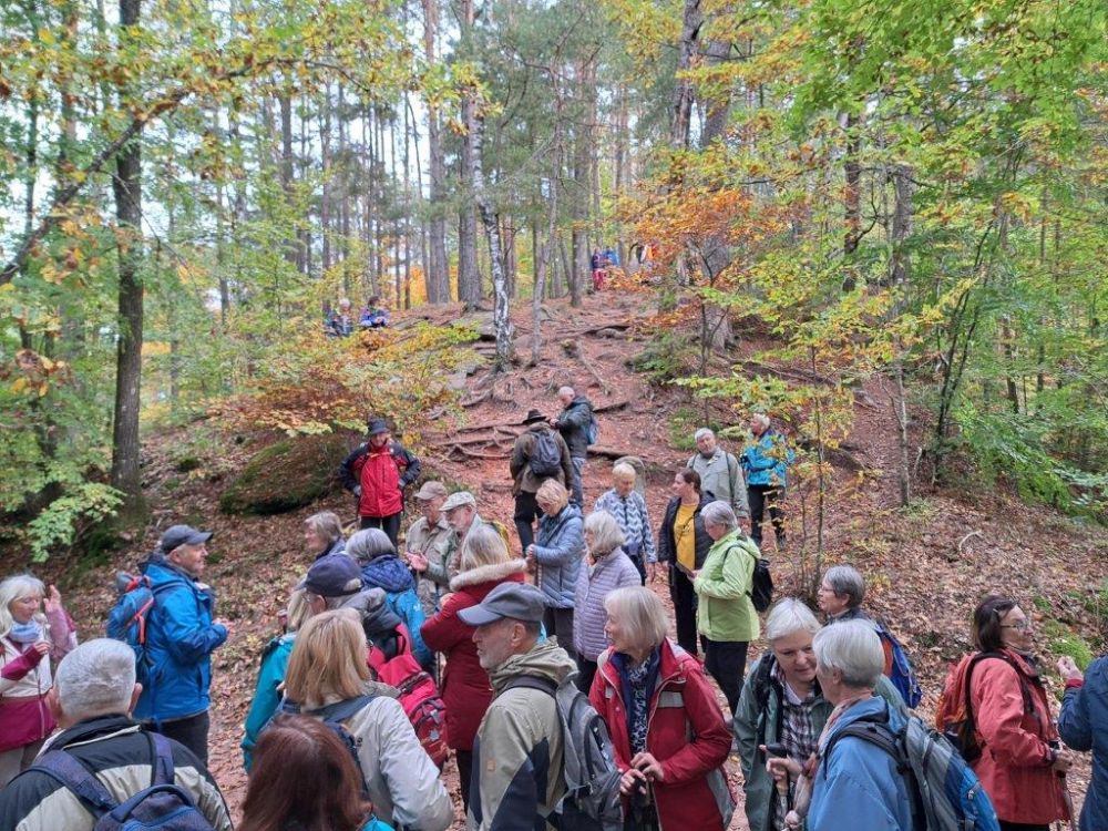 Die Wanderung startete bei bestem Herbst-Wanderwetter für beide Gruppen in Eppenbrunn am Stüdenbach-Weiher. Von da aus ging es den Hilsterbach entlang, am Spießweiher vorbei Richtung Altschlossfelsen. Wir folgten dem Altschlosspfad und besichtigten die 1,5 km langen und 30 m hohen bizarren Buntsandsteinfelsformationen der Altschlossfelsen. Danach ging es weiter zur französischen Grenze, und wir folgten ein Stück dem Grenzweg, wo wir oft ein "Bonjour" hörten. Am Martelbach und später am Eppenbrunner Bach und dem Helmut-Kohl Wanderweg entlang ging es dann zurück nach Eppenbrunn zum Hotel-Restaurant Kupper, wo die Kurzwanderstrecke nach ca. 7,5 km und ca. 90 hm endete.