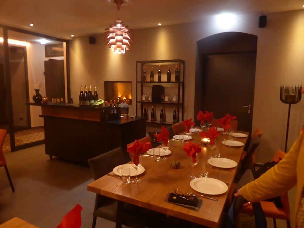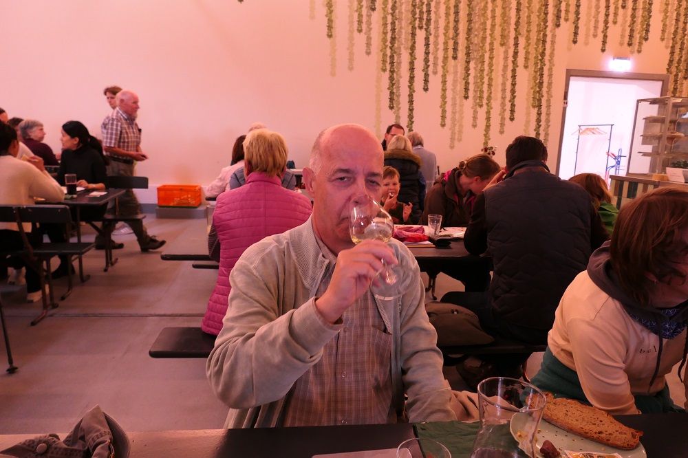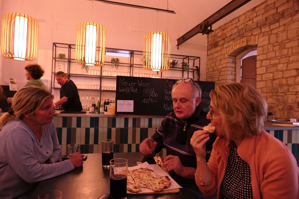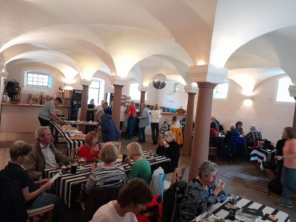 Von Eich aus fuhren wir mit dem Bus in das nahegelegene Guntersblum (Weingut Heiko Strub). Im historischen Kreuzgewölbestall, einer sogenannten Kuhkapelle, war für uns der Tisch gedeckt mit Spundekäs und Laugenbrot. Serviert wurde uns außerdem Winzergulasch (Rind) mit Spätzle und hausgemachtem Rotkohl bzw. eine vegetarische Variante, Spätzle mit Pilzrahmsoße und Rotkohl. Um 21:30 Uhr ging es wieder zurück in die Pfalz.