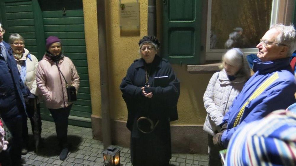Unsere Abendveranstaltung führte uns in die historische Altstadt von Weinheim. Nach einem Spaziergang von ca. 3 km durch den Weinheimer Schlosspark empfing uns am Marktplatzbrunnen vor dem Alten Rathaus der Nachtwächter. Auf dem einstündigen Rundgang erzählte er uns Anekdoten und Geschichten vom „Nachtleben“ aus vergangenen Tagen, als der Nachtwächter noch die Funktion der Polizei hatte.