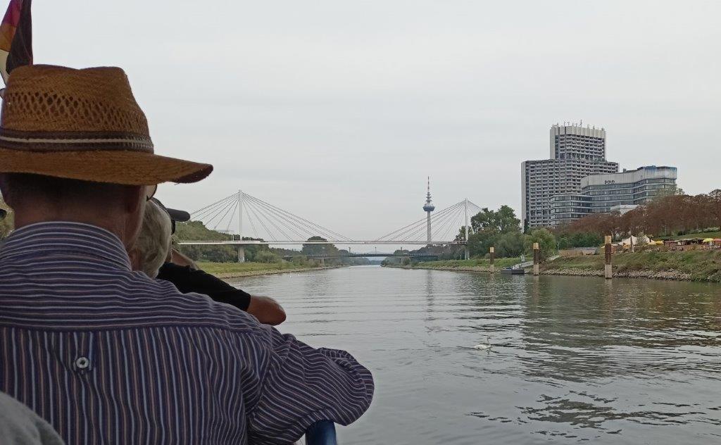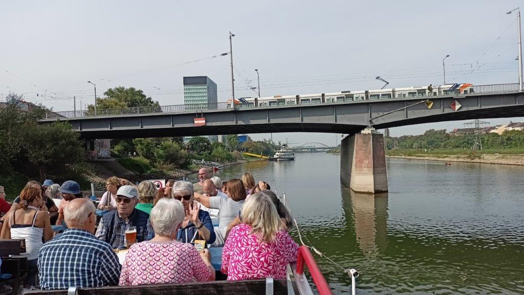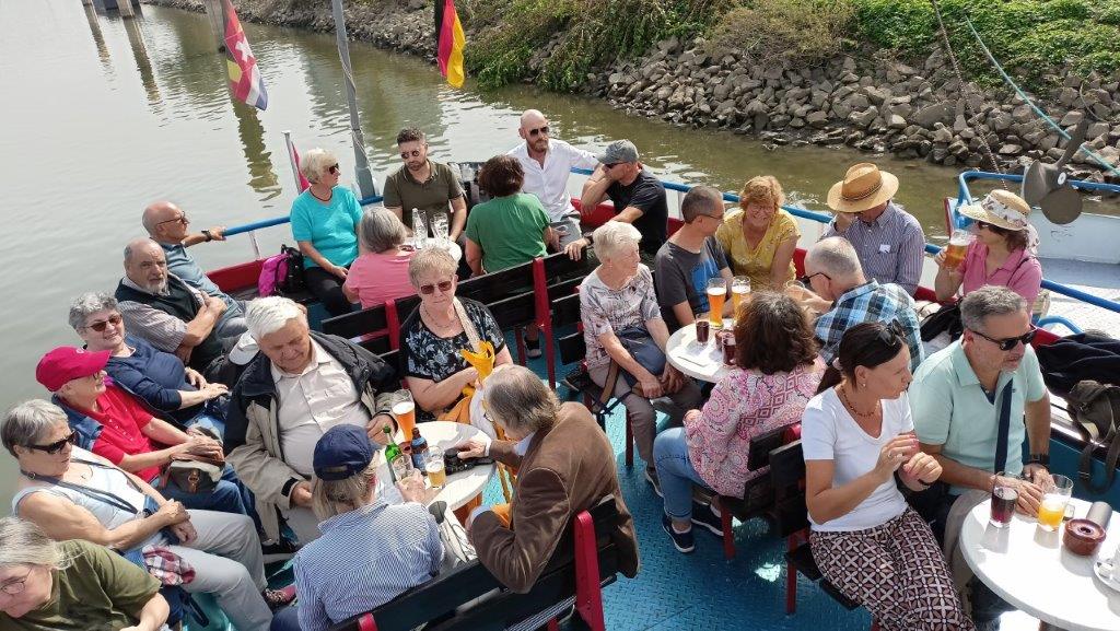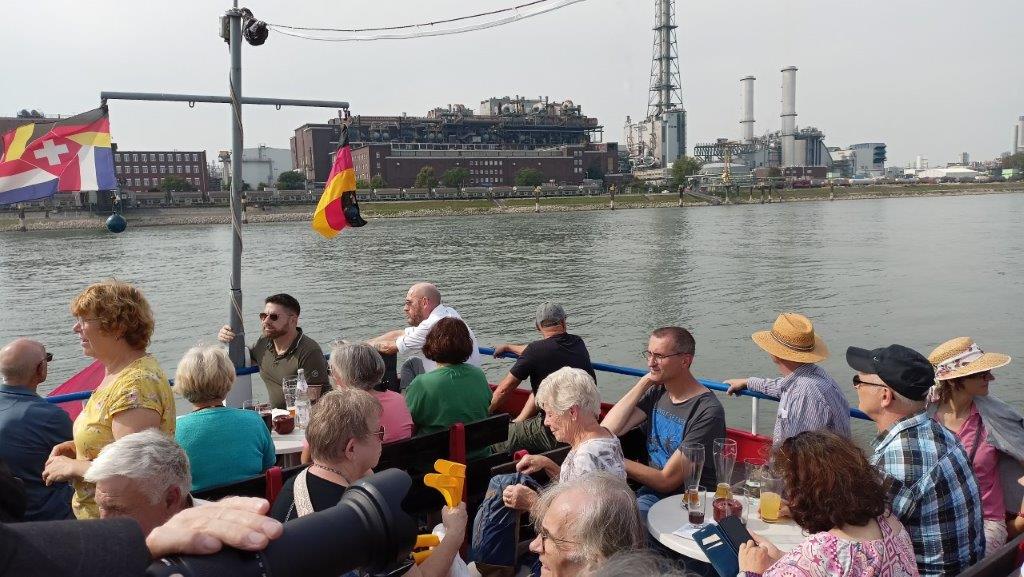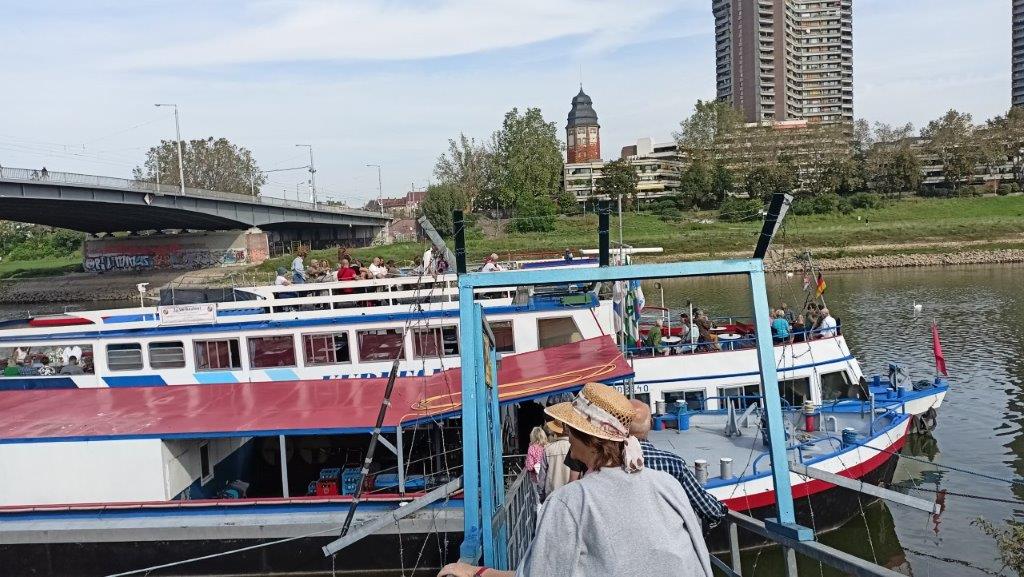 Die Fahrt startete bei wunderschönem Spätsommerwetter an der Anlegestelle Kurpfalzbrücke mit Blick auf die Quadrate der Innenstadt zur linken und der Neckarwiese zur rechten Hand. Es ging bis zur Neckarspitze, wo der Neckar in den Rhein mündet. Die weitere Fahrt rheinaufwärts eröffnete einen spektakulären Blick auf die Industrieanlagen der BASF, dem größten zusammenhängenden Chemieareal der Welt. Der anschließende Abstecher führte in das Containerterminal im Mühlauhafen. Hier lagern riesige Mengen an Containern, die darauf warten, in alle Welt verschifft zu werden. Nach 2 1/4 h und vielen Informationen, die wir unterwegs durch den Schiffsführer erhielten, ging es wieder per Straßenbahn und Zug zurück in die Pfalz.